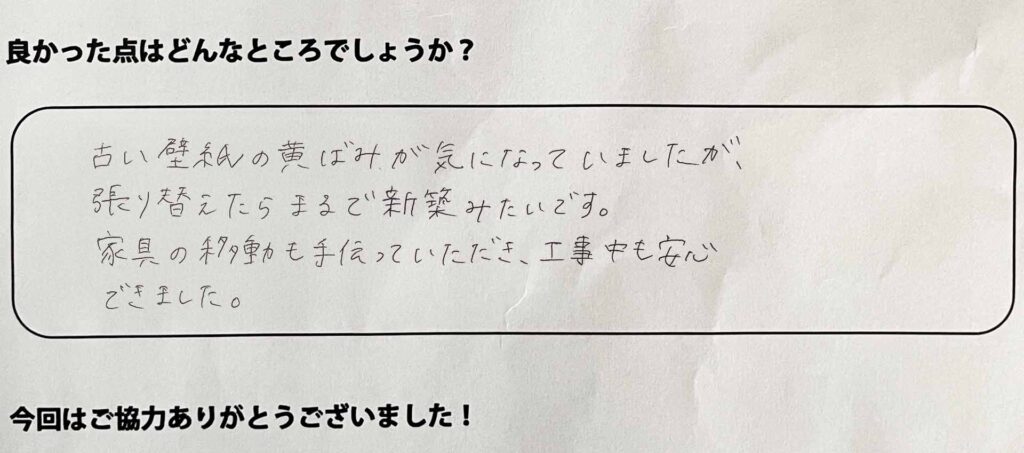 古い壁紙の黄ばみが気になっていましたが、張り替えたらまるで新築みたいです。家具の移動も手伝っていただき、工事中も安心できました。